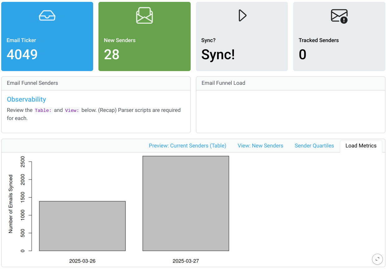 The dashboard depicts the volume of emails processed, and observations on the recent batch. See Figure 1.
